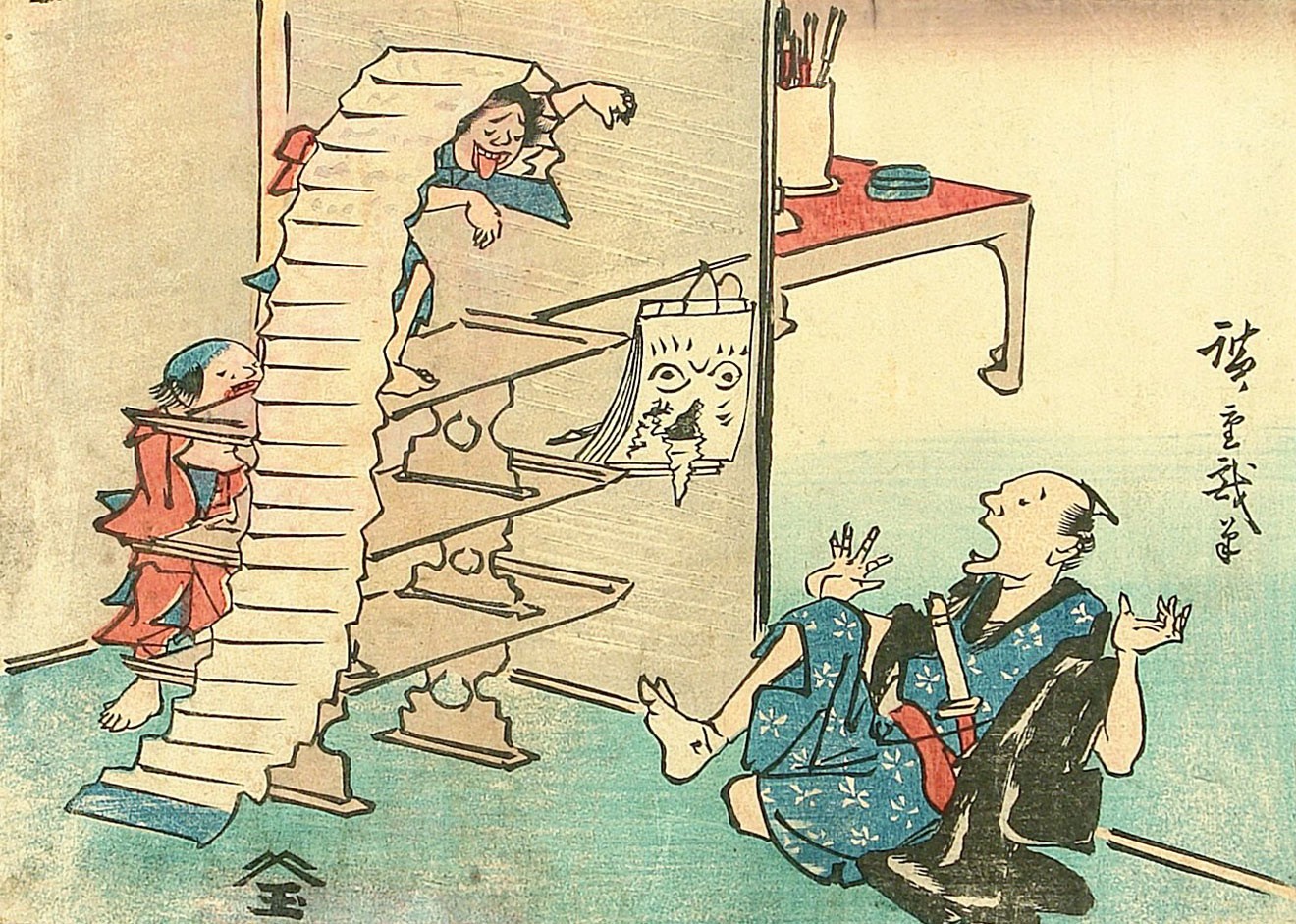 Напуганный самурай. Гравюра Утагавы Хиросигэ. 1830–1840 годы.Мальчики из тэракои напугали самурая, прикинувшись привидением.ukiyo-e.org