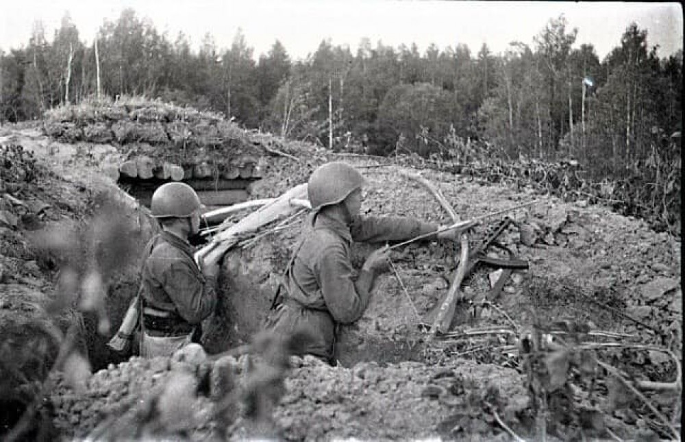 Финские офицеры кидаются листовками с матюками в сторону советских траншей. |Фото: waralbum.ru.