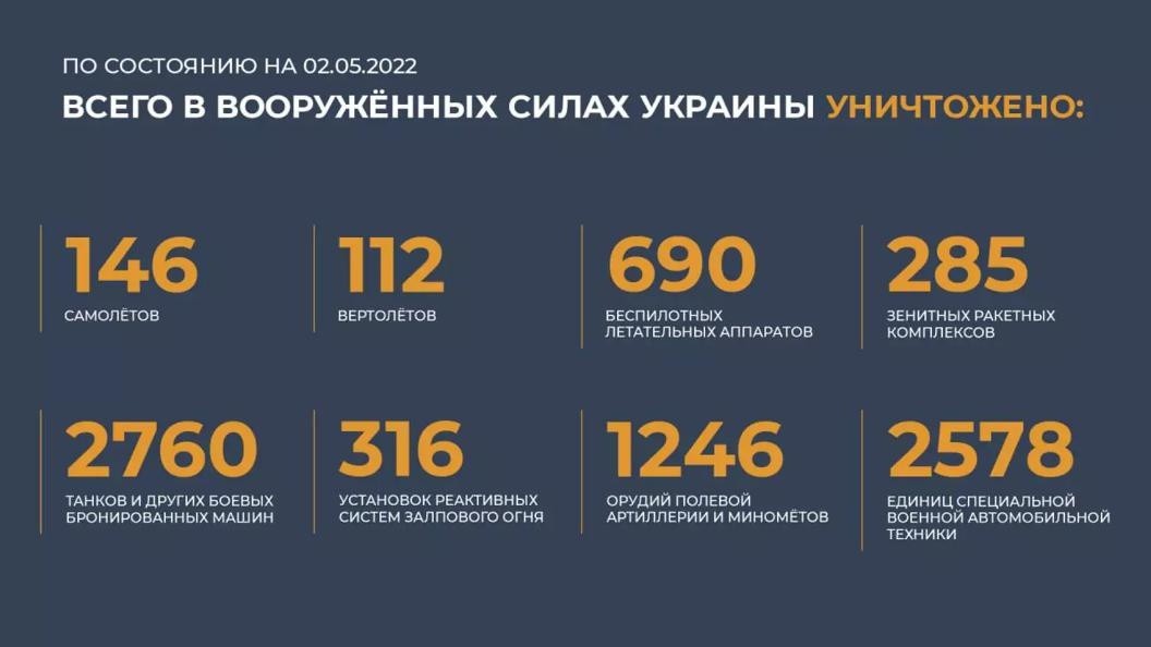 По уточненным данным, с начала проведения специальной военной операции уничтожены: 146 самолетов, 112 вертолетов, 690 беспилотных летательных аппаратов, 285 зенитных ракетных комплексов, 2760 танков и других боевых бронированных машин, 316 установок реактивных систем залпового огня, 1246 орудий полевой артиллерии и минометов, а также 2578 единиц специальной военной автомобильной техники.