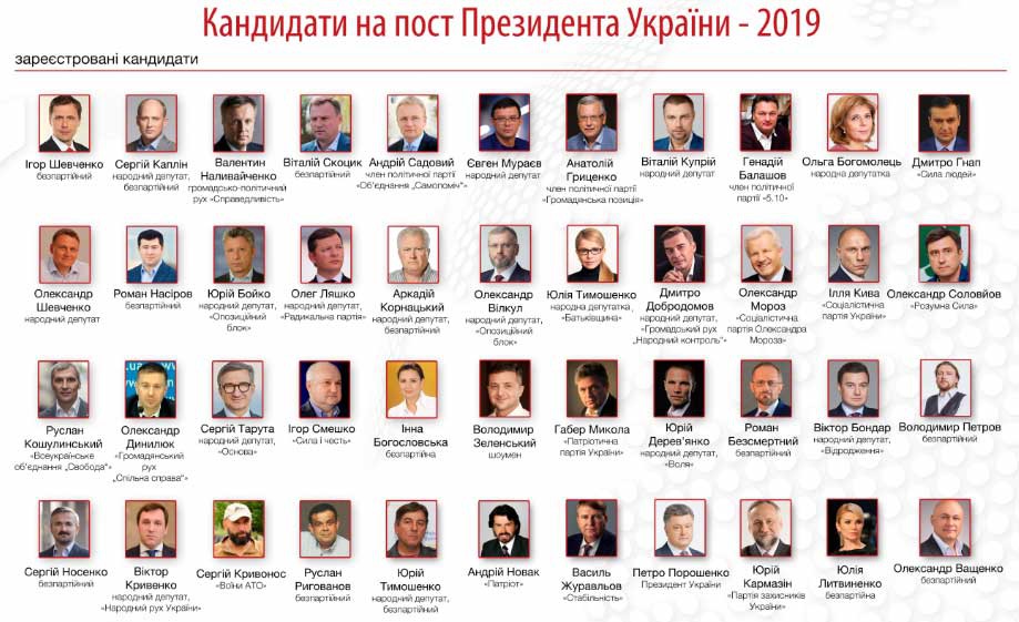 Предлагаем ознакомиться с полным списком кандидатов, которые баллотируются на выборах президента Украины в 2019 году и будут представлены в бюллетене: